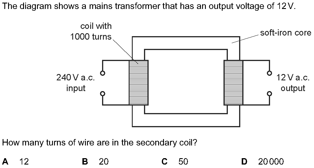 (a) The transformer in Fig. 8.1 is used to convert 240V a.c. to 6V a.c.Fig. 8.1(i) Using the information above, calculate the number of turns on the s...