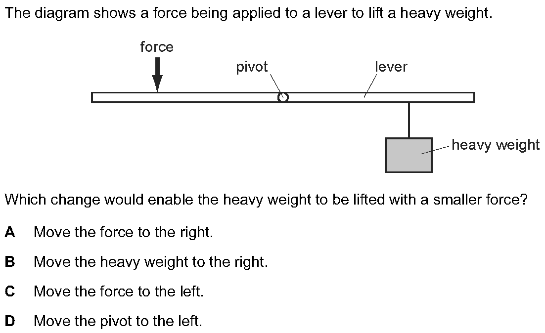 The diagram shows a force being applied to a lever to lift a heavy weight. Which change would enable the heavy weight to be lifted with a smaller forc...
