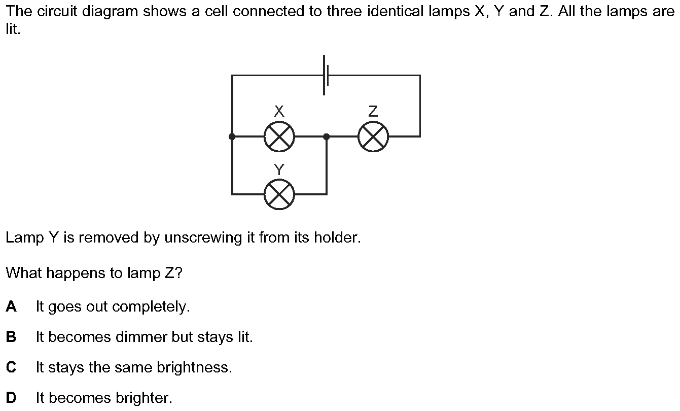 The diagram shows an electric circuit containing three meters, X, Y and Z, all connected correctly. What are meters X, Y and Z?[Table_1]XYZAammeteramm...