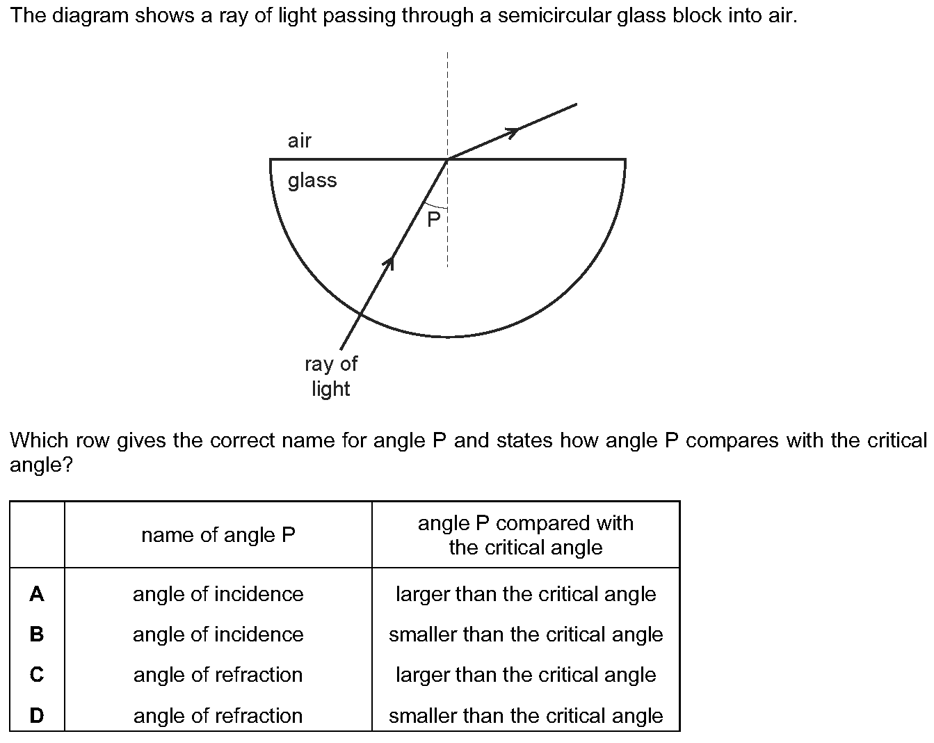 The diagram shows a ray of light travelling from X. Angle P is less than the critical angle.In which direction does the ray continue?