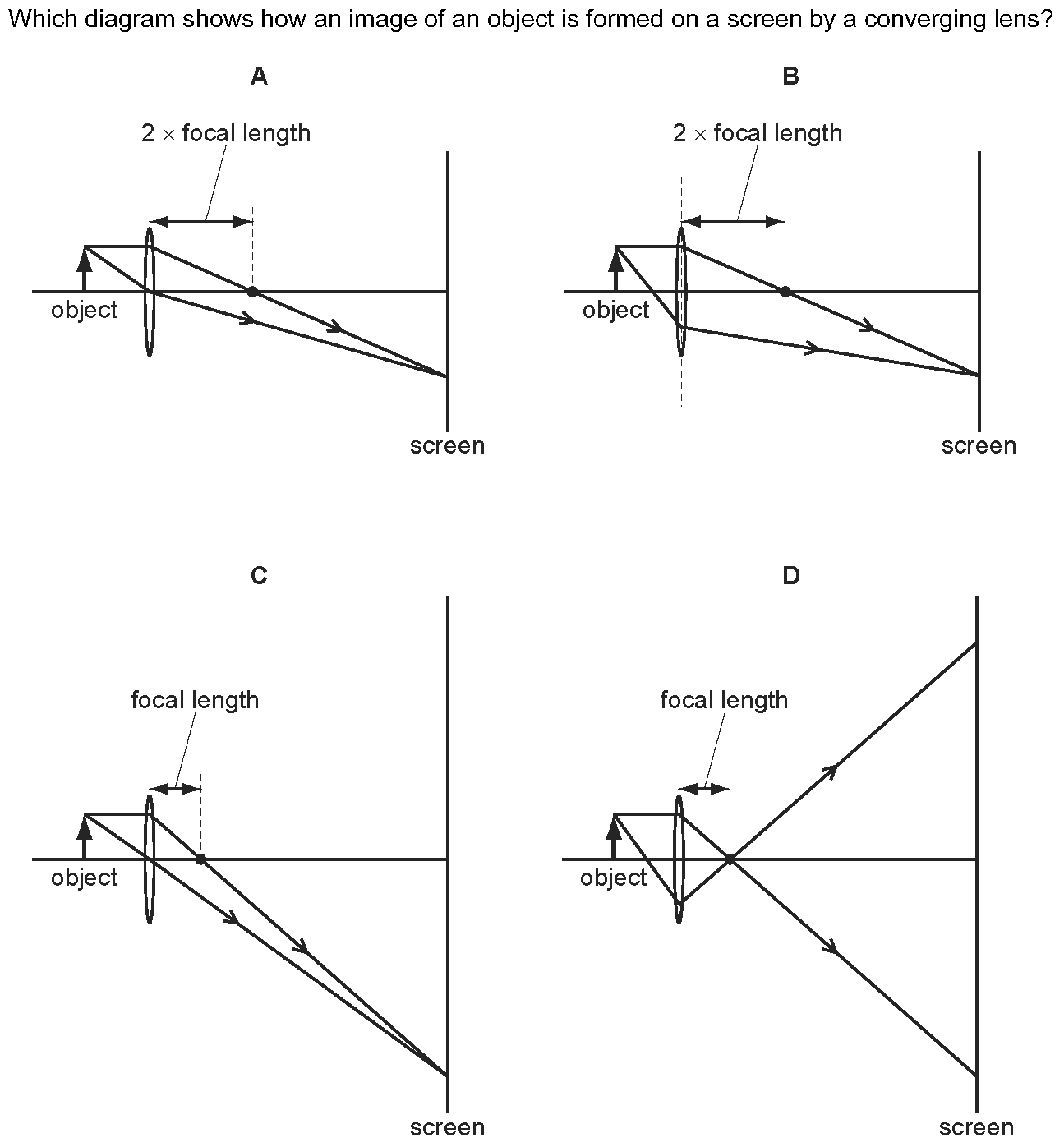 The diagram shows the path of a ray of light passing through a principal focus F of a lens. Which broken line shows the direction of the ray after it ...