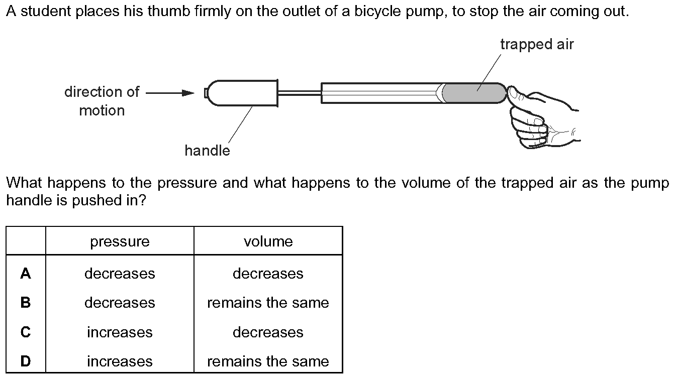 The pressure of a fixed mass of gas in a cylinder is measured. The volume of the gas in the cylinder is then slowly decreased. The temperature of the ...
