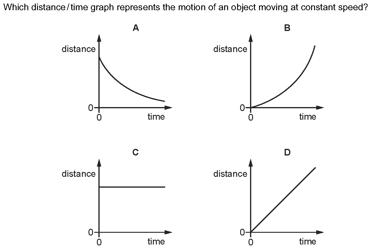 Which distance/time graph represents the motion of an object moving at constant speed? [Image_1: Graphs A, B, C, D with axes for distance and time]