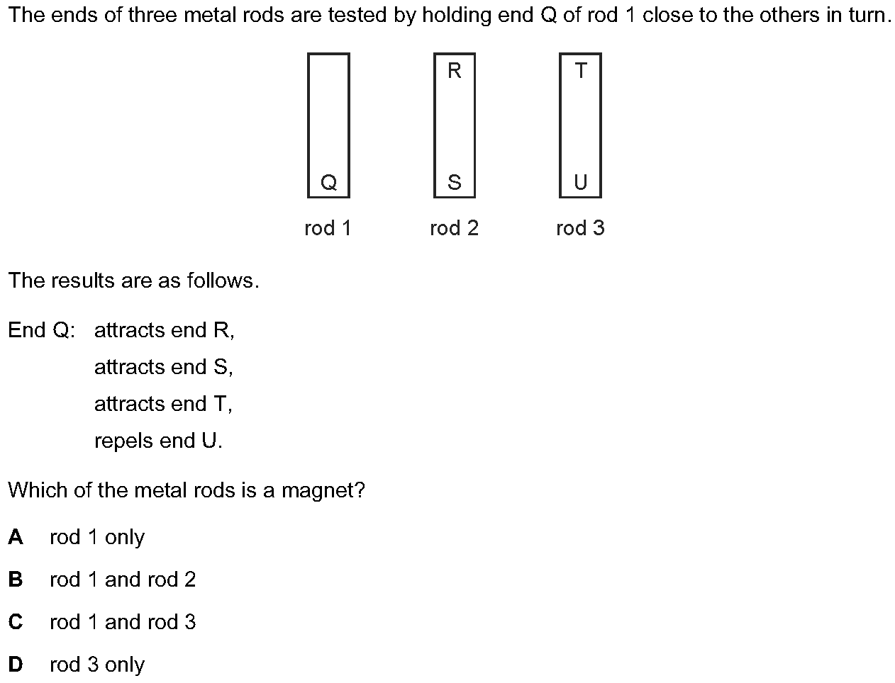 Four nails, A, B, C and D, are tested to find which makes the strongest permanent magnet.One of the nails is placed against a bar magnet and the numbe...