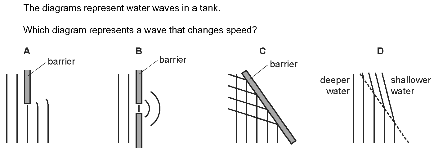 The diagrams show water waves that move more slowly after passing into shallow water at the broken line.Which diagram shows what happens to the waves?...