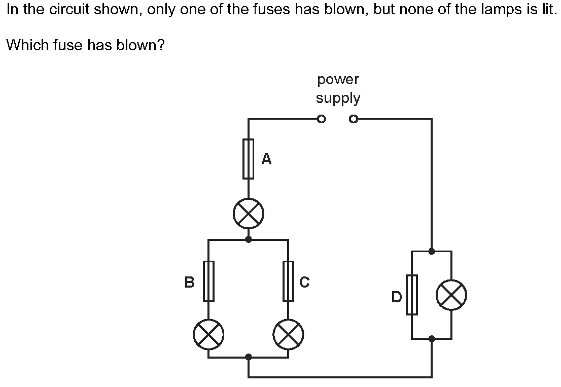 The diagrams show four arrangements of resistors.Which arrangement has the smallest total resistance?A: [Image_A with 4Ω icon]B: [Image_B with 2Ω an...
