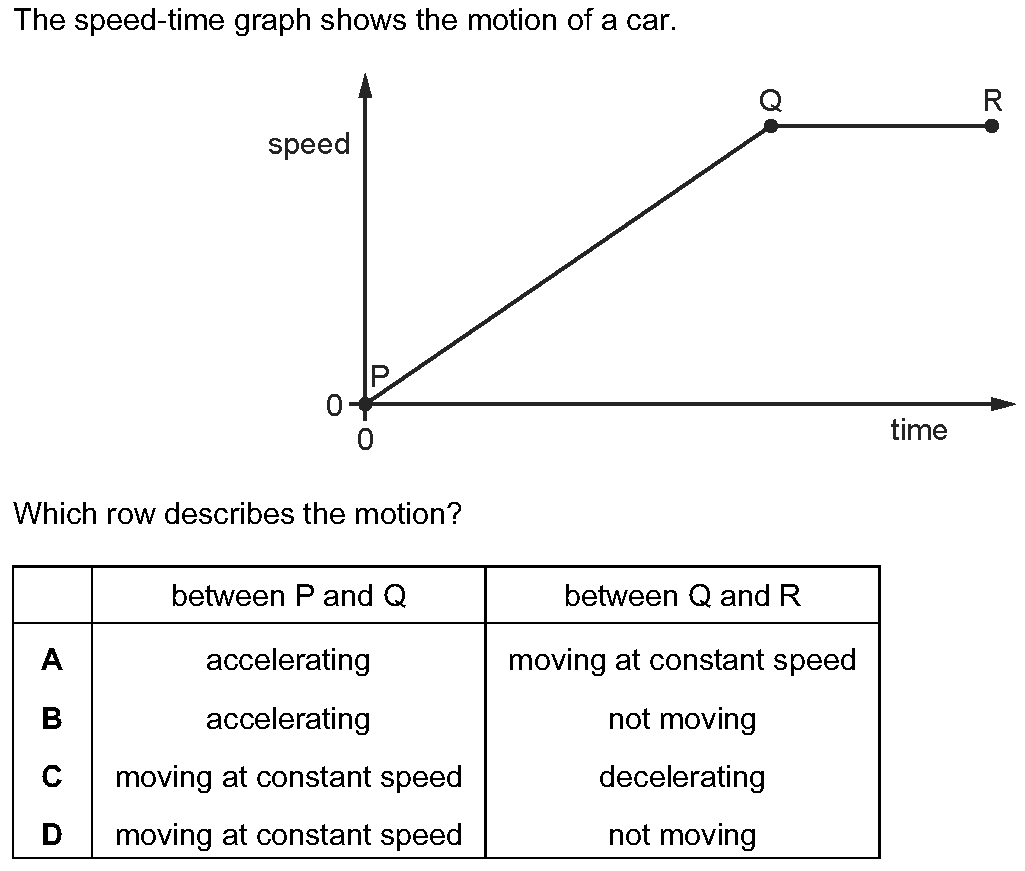A car moves with constant speed and then constant acceleration.Which graph is the speed-time graph for the car?[Image_1: Graphs A, B, C, D]