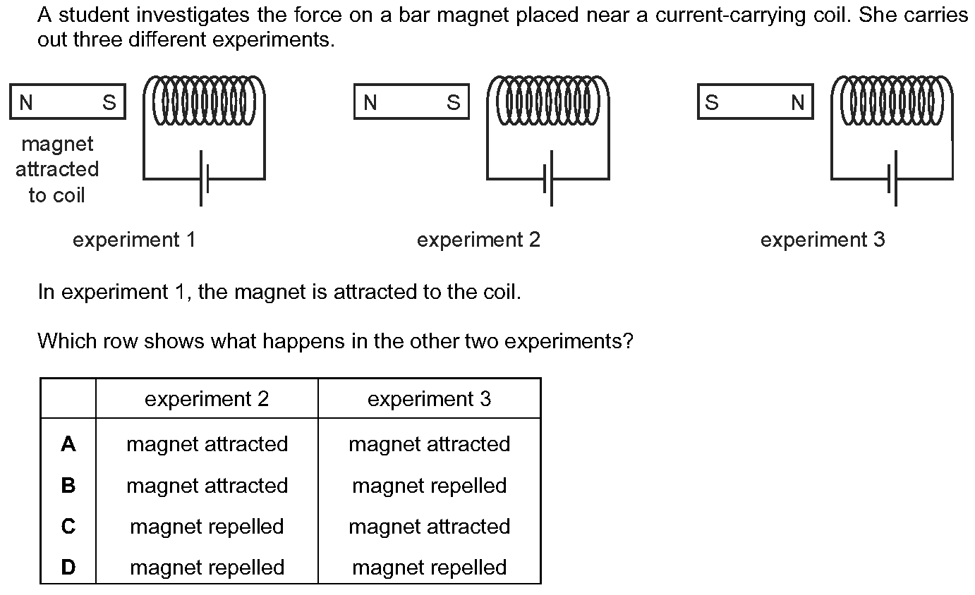 Four nails, A, B, C and D, are tested to find which makes the strongest permanent magnet.One of the nails is placed against a bar magnet and the numbe...