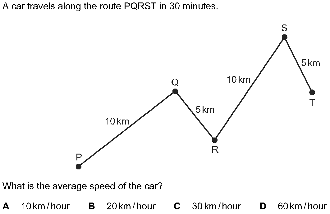 A car travels 100 km. The journey takes two hours. The highest speed of the car is 80 km/h, and the lowest speed is 40 km/h. What is the average spee...