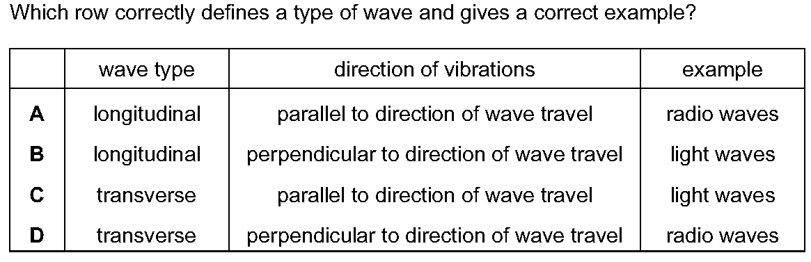 Which group contains only transverse waves?A infra-red waves, light waves, sound wavesB infra-red waves, light waves, ultra-violet wavesC infra-red wa...