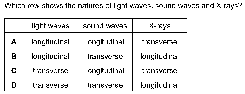 Which group contains only transverse waves?A infra-red waves, light waves, sound wavesB infra-red waves, light waves, ultra-violet wavesC infra-red wa...