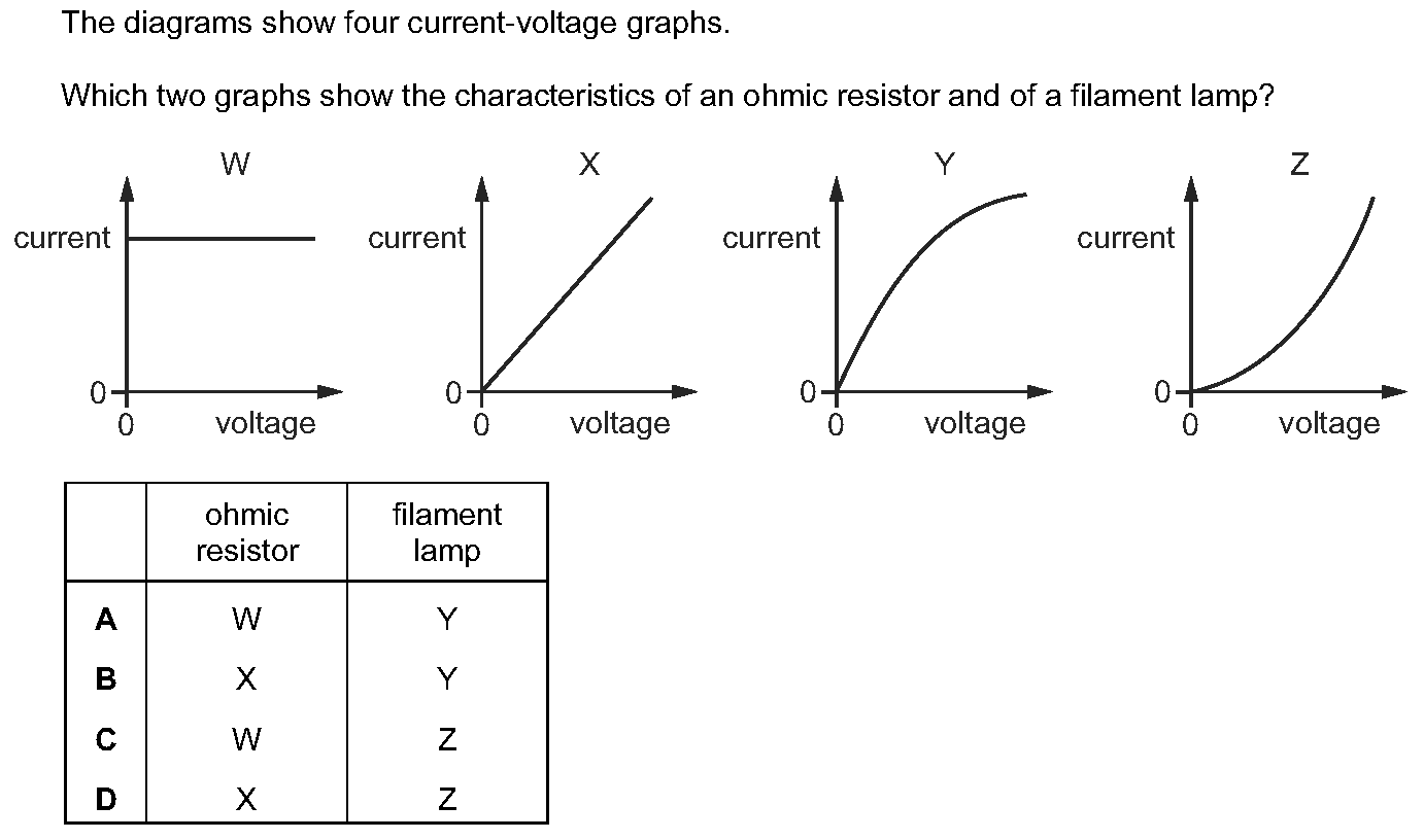 The diagram shows an electric circuit containing three meters, X, Y and Z, all connected correctly. What are meters X, Y and Z?[Table_1]XYZAammeteramm...