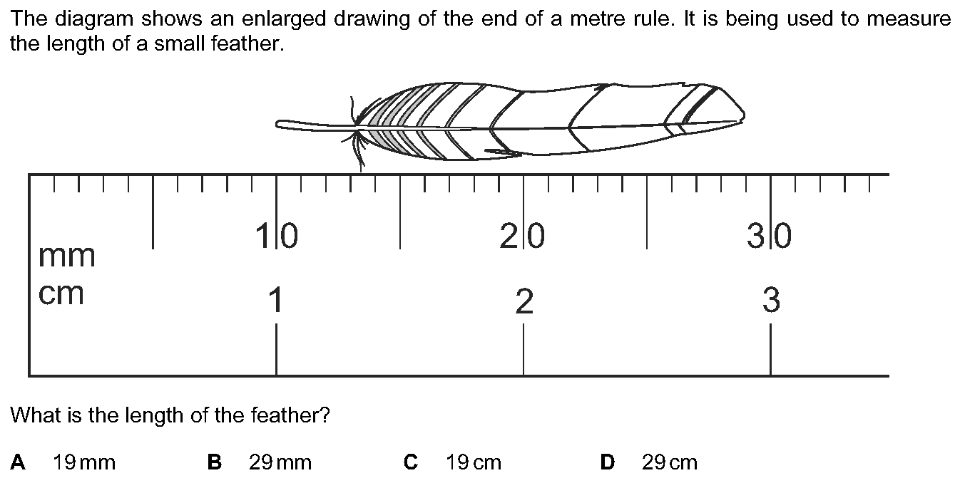 The diagram shows an enlarged drawing of the end of a metre rule. It is being used to measure the length of a small feather. What is the length of th...