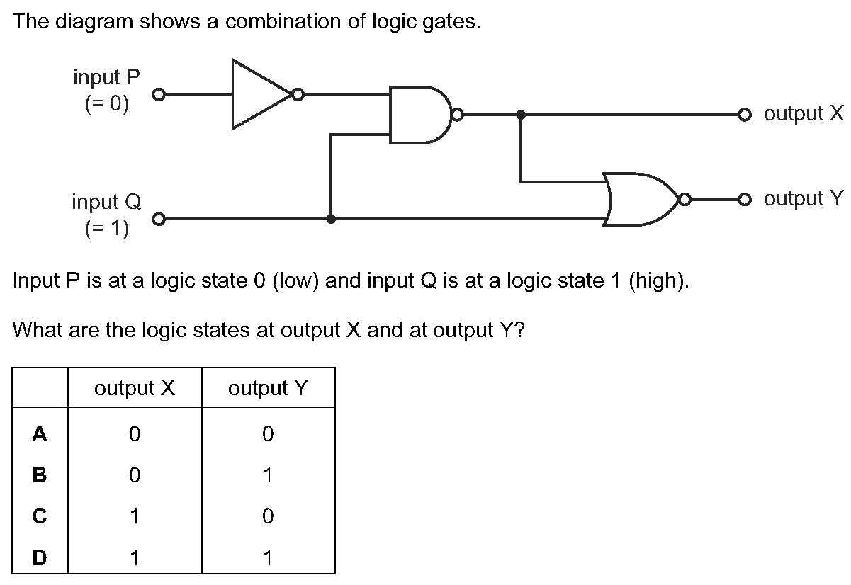 (a) In the space below, draw the symbol for an OR gate.[1](b) Describe the action of an OR gate in terms of its inputs and outputs.......................