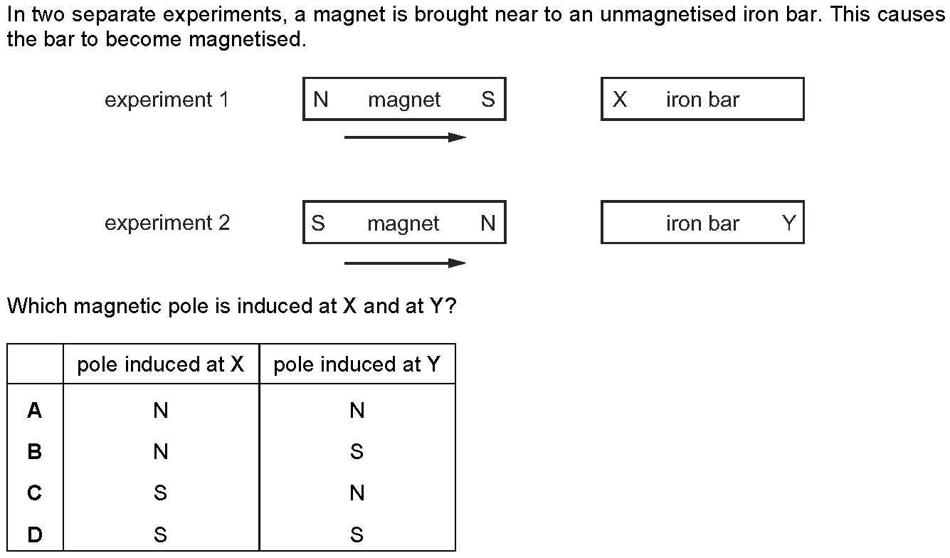 A horseshoe magnet is brought near to an unmagnetised iron bar. [Image_1: Diagram of horseshoe magnet with labeled N and S poles near an iron bar] W...