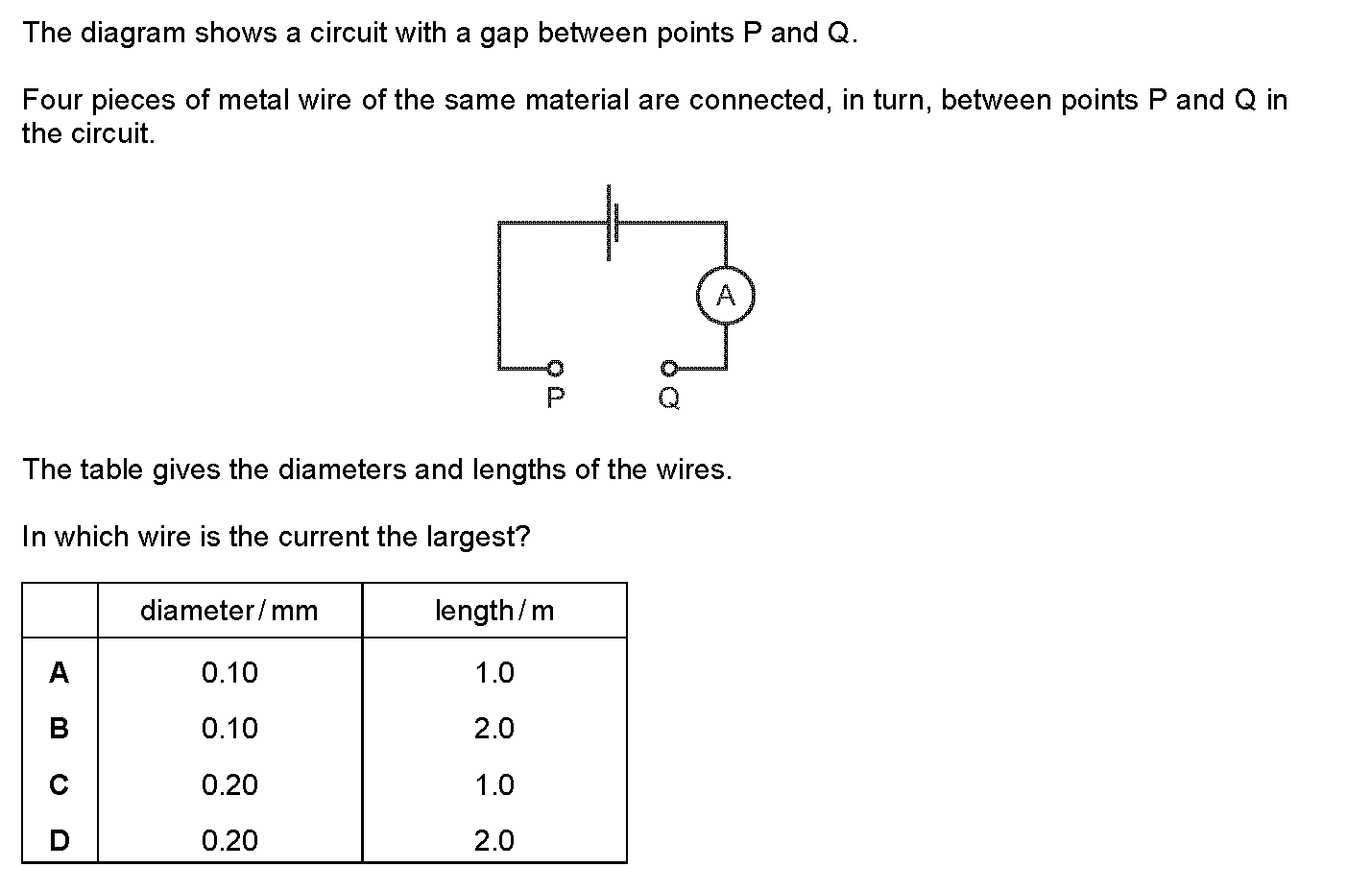 The diagrams show four arrangements of resistors.Which arrangement has the smallest total resistance?A: [Image_A with 4Ω icon]B: [Image_B with 2Ω an...