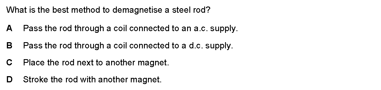 Four nails, A, B, C and D, are tested to find which makes the strongest permanent magnet.One of the nails is placed against a bar magnet and the numbe...