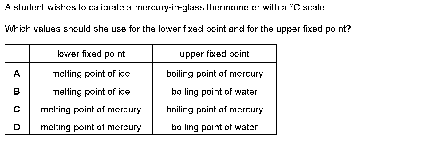 To mark the lower fixed point of a Celsius scale on a thermometer, the thermometer should be placed inA. pure alcohol.B. pure distilled water.C. pure ...