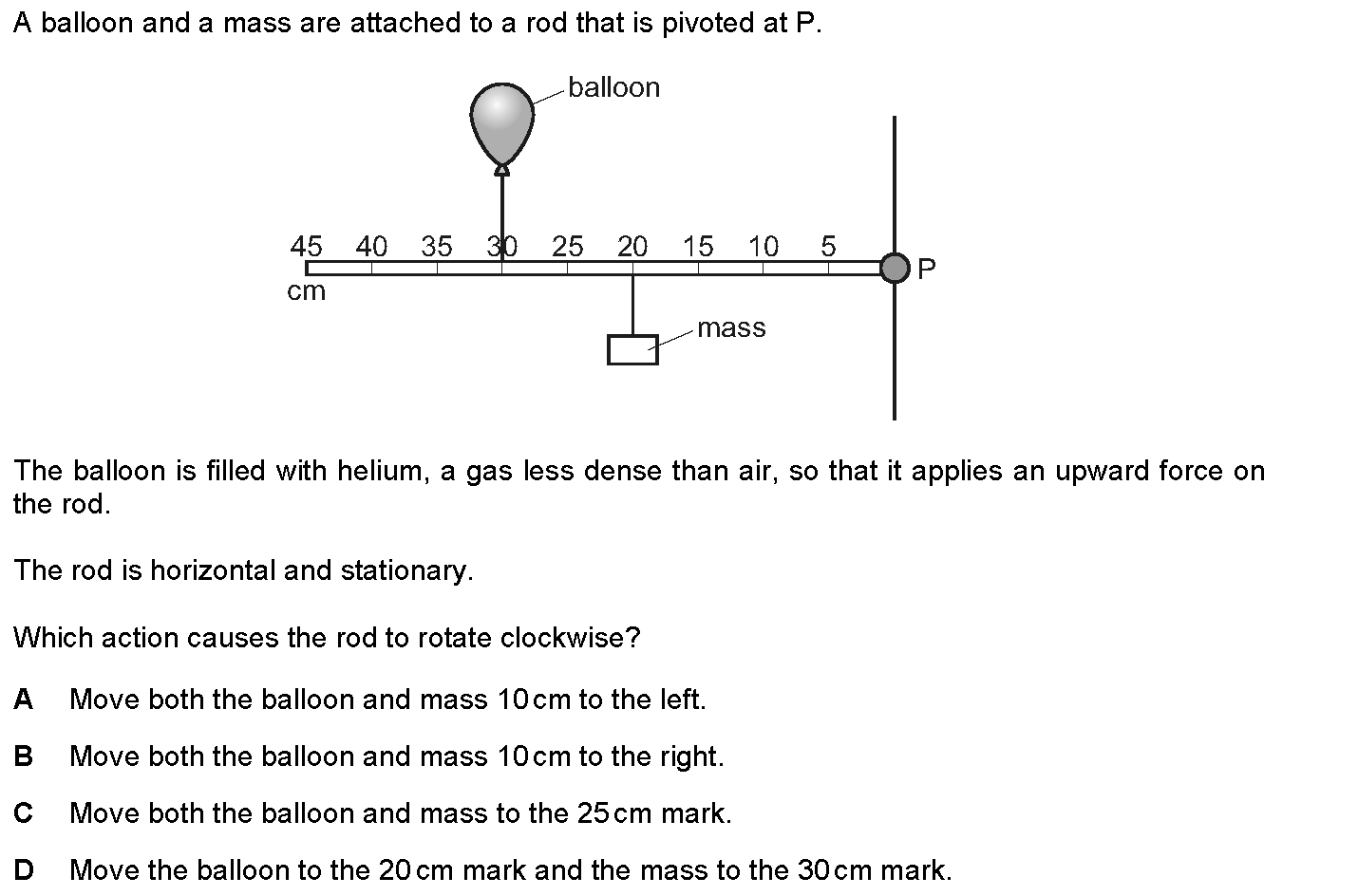 A balloon and a mass are attached to a rod that is pivoted at P.The balloon is filled with helium, a gas less dense than air, so that it applies an up...