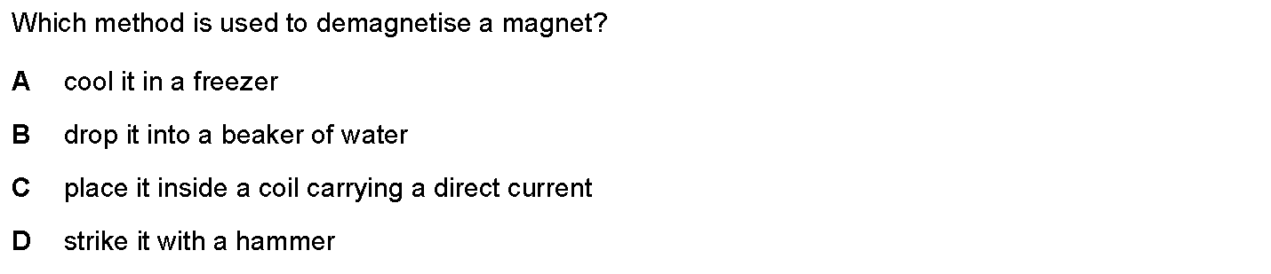 Four nails, A, B, C and D, are tested to find which makes the strongest permanent magnet.One of the nails is placed against a bar magnet and the numbe...