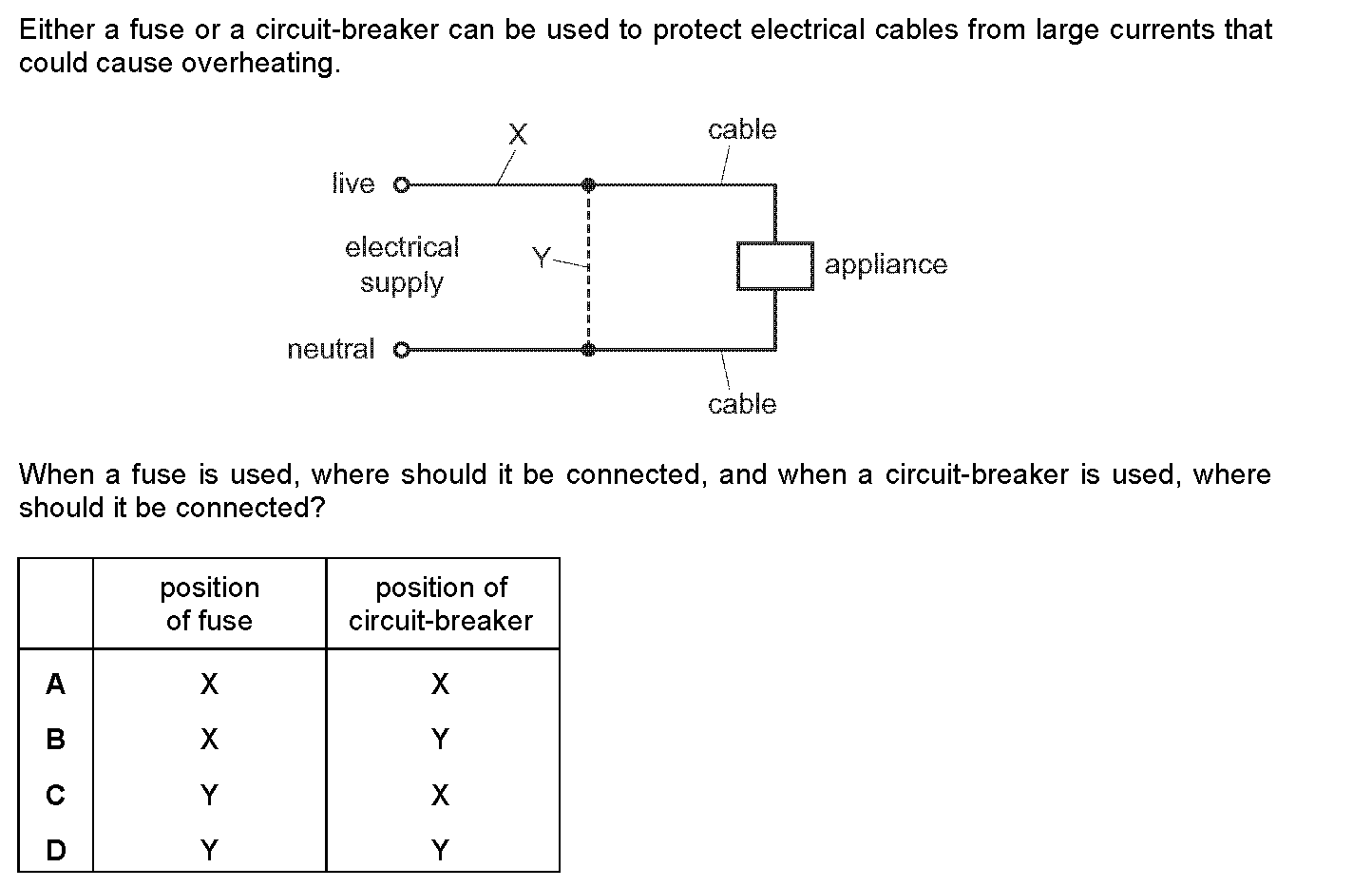 The diagram shows an electric circuit containing three meters, X, Y and Z, all connected correctly. What are meters X, Y and Z?[Table_1]XYZAammeteramm...