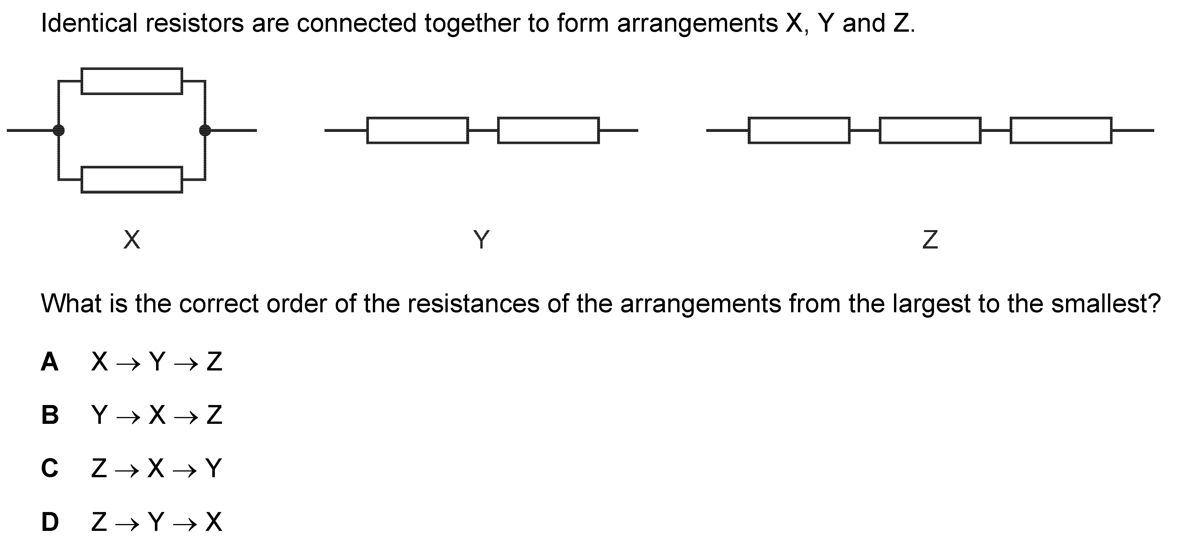 The diagrams show four arrangements of resistors.Which arrangement has the smallest total resistance?A: [Image_A with 4Ω icon]B: [Image_B with 2Ω an...