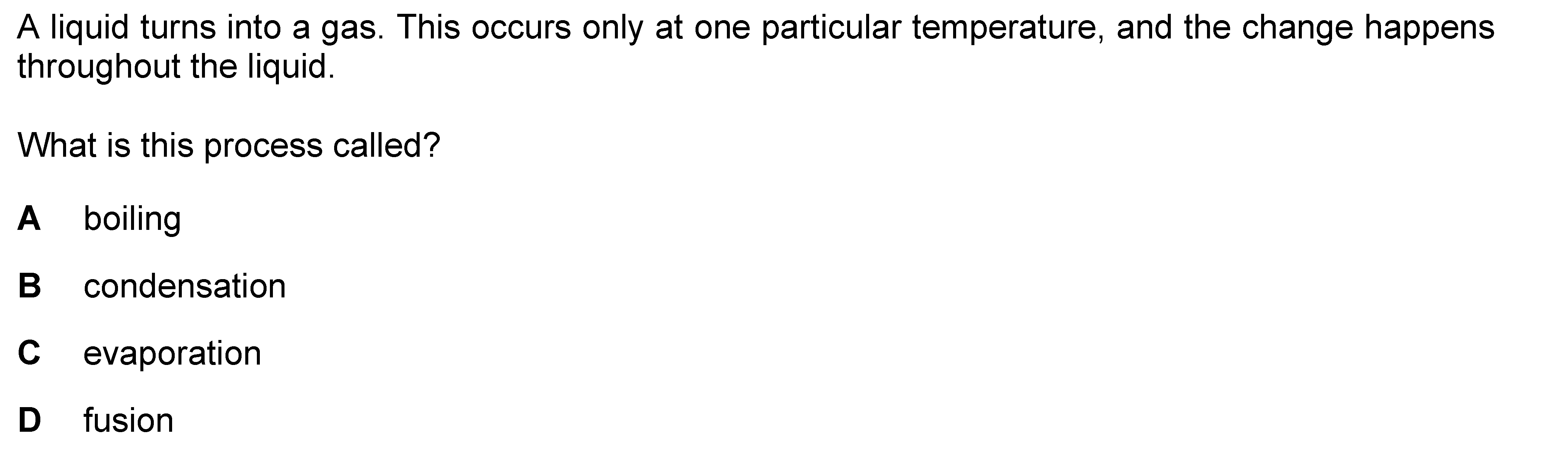 In an experiment, some of a substance changes from a liquid to a gas. The temperature of the remaining liquid changes because of this.What is the name...