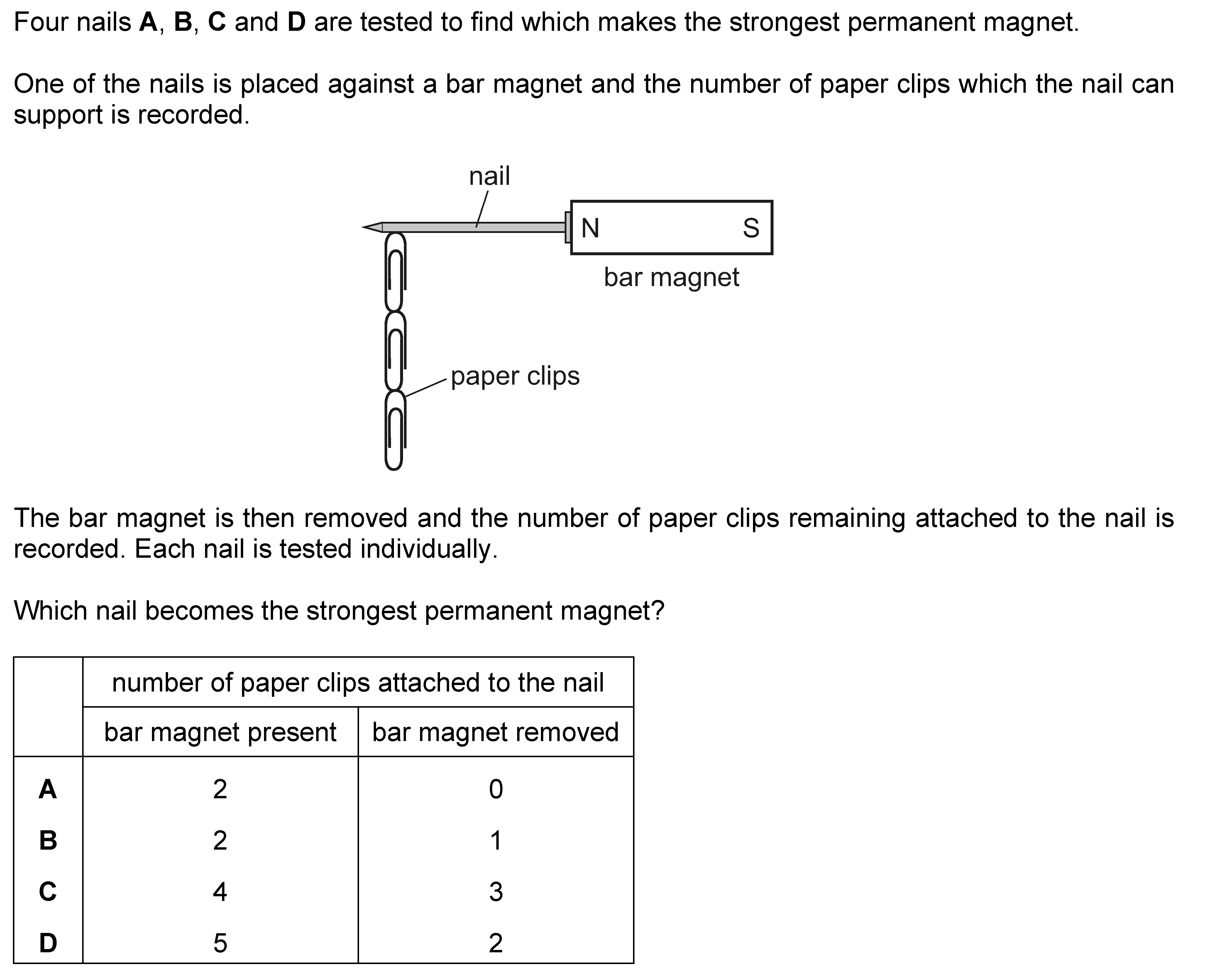 Four nails, A, B, C and D, are tested to find which makes the strongest permanent magnet.One of the nails is placed against a bar magnet and the numbe...