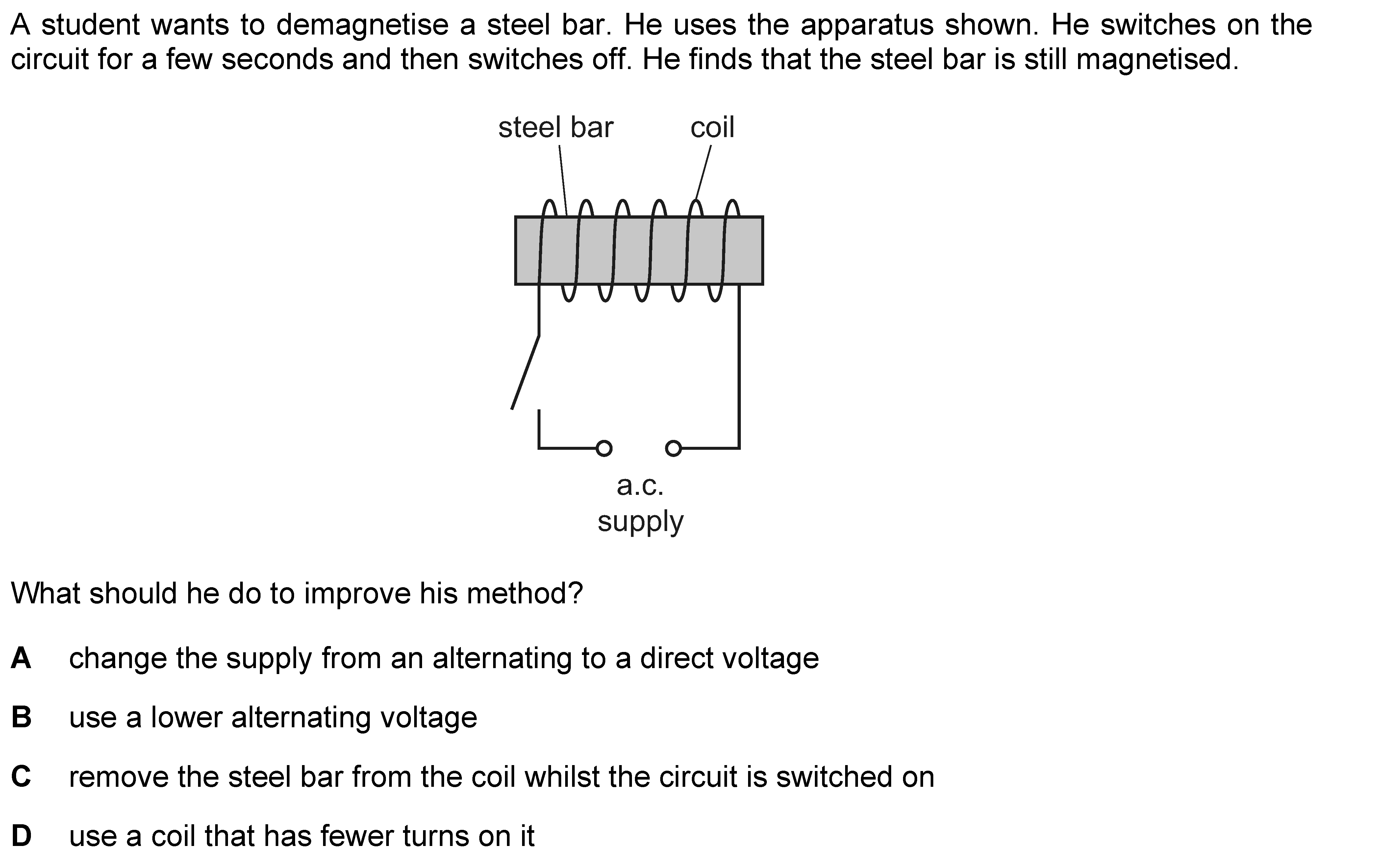 An electromagnet is used to separate magnetic metals from non-magnetic metals. Why is steel unsuitable as the core of the electromagnet?A It forms a p...