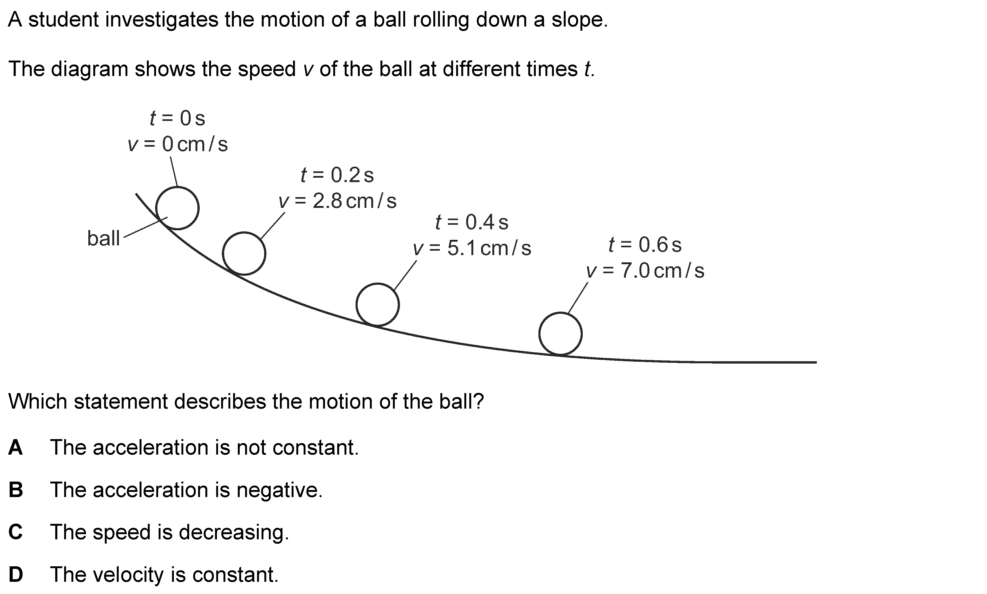 A student investigates the motion of a ball rolling down a slope.The diagram shows the speed $v$ of the ball at different times $t$.Which statement de...