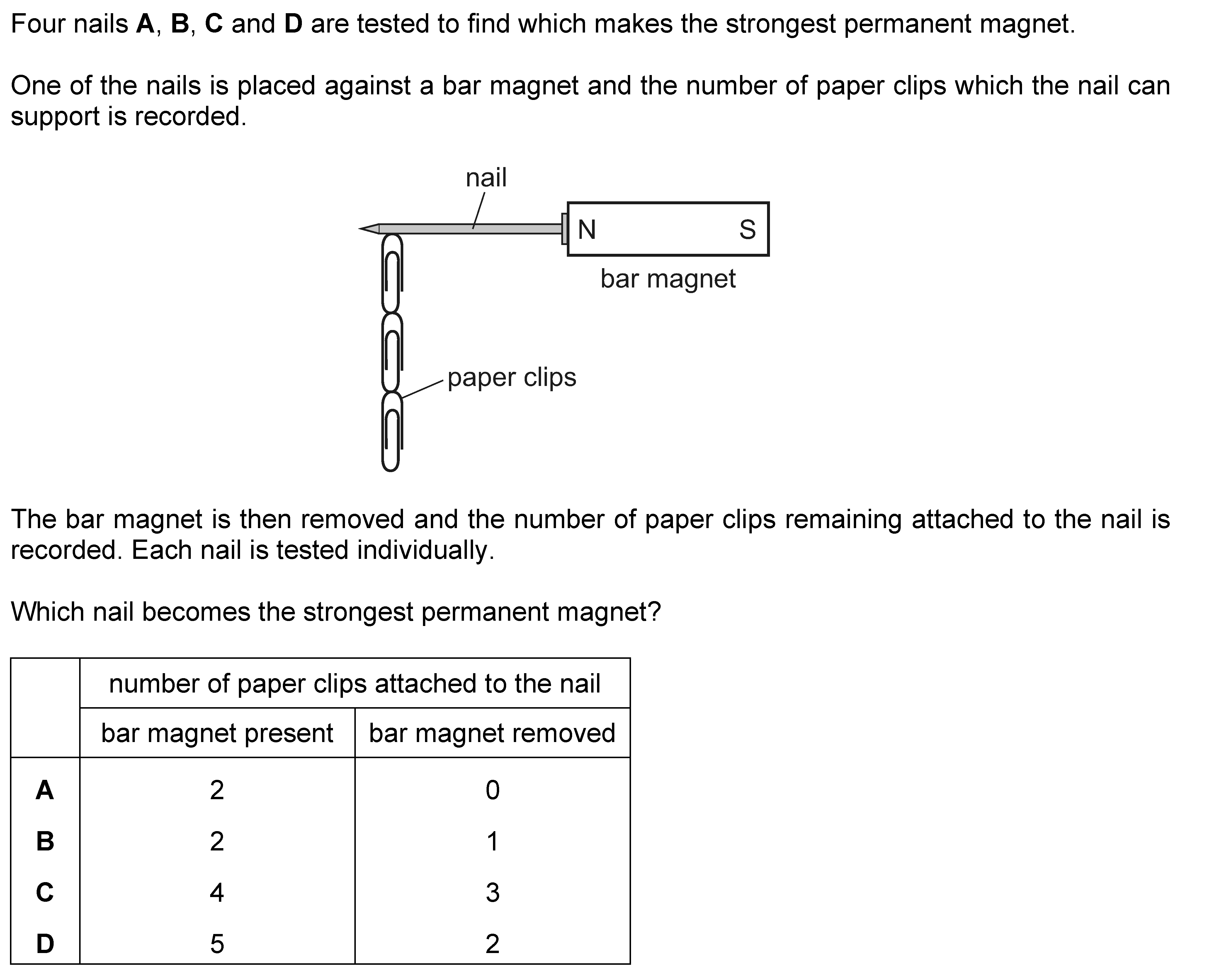 Four nails, A, B, C and D, are tested to find which makes the strongest permanent magnet.One of the nails is placed against a bar magnet and the numbe...