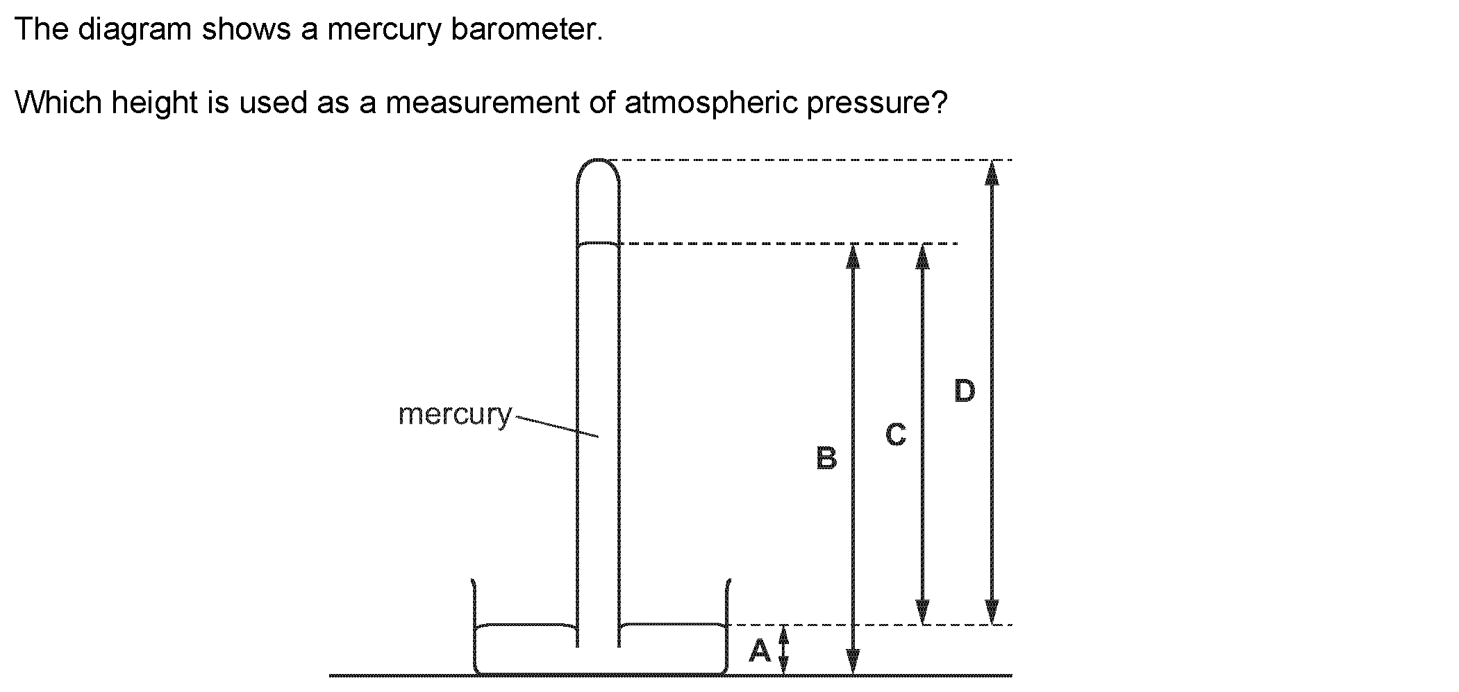 What is a simple mercury barometer designed to measure?A. the pressure beneath a liquidB. the pressure of a gas supplyC. the pressure of car tyresD. t...