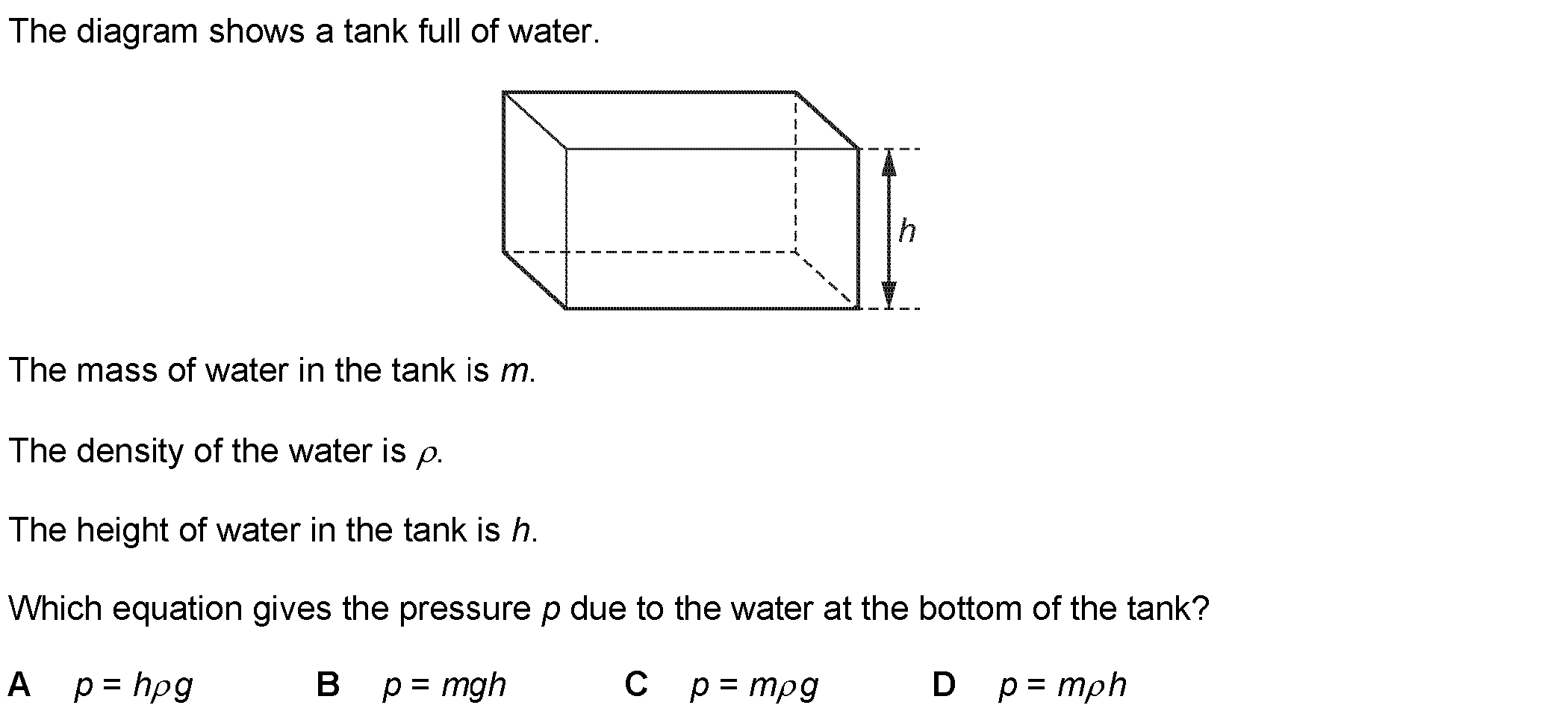 A student fills two containers with water (density 1.0 g/cm^3) and two with oil (density 0.8 g/cm^3), as shown in the diagrams.In which container is t...
