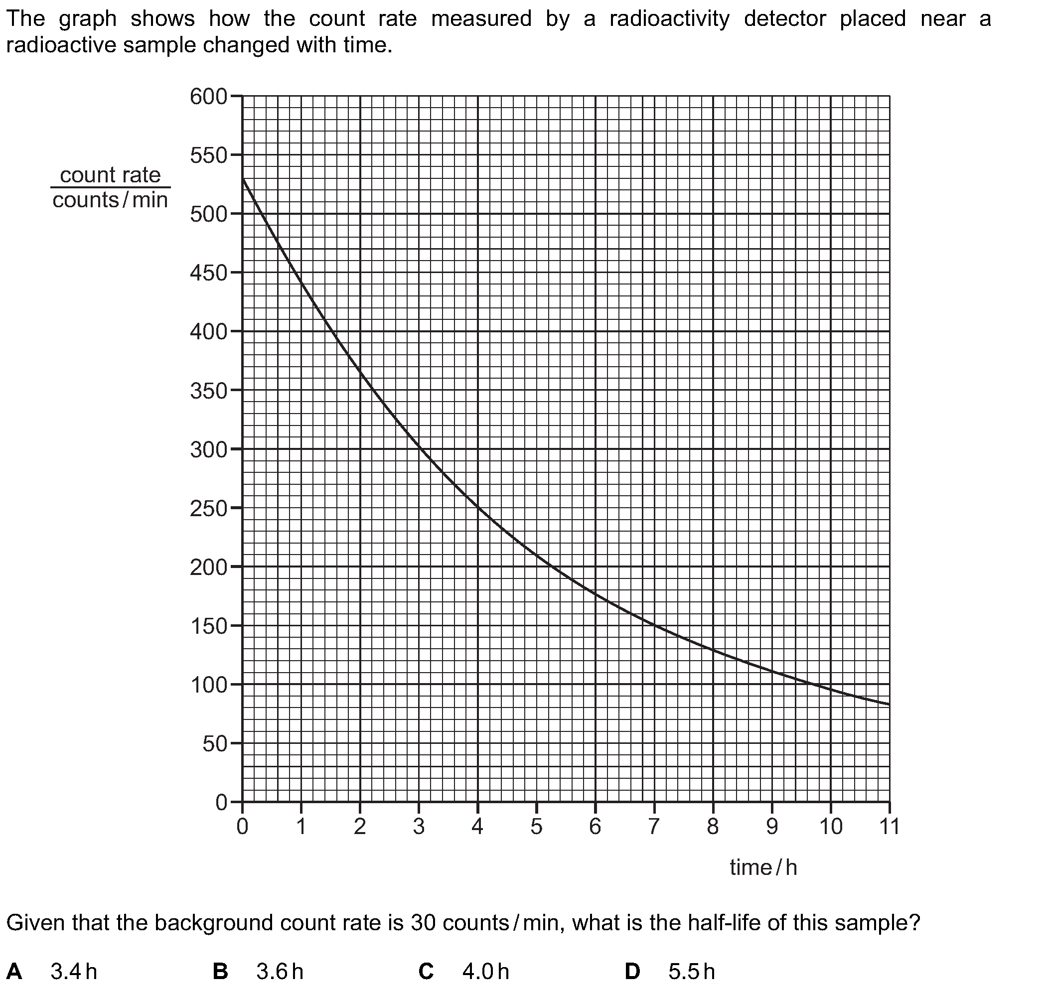 The graph shows the activity of a radioactive source over a period of time. What is the half-life of the source? A $\frac{1}{2}$ hour B 1 hour C ...