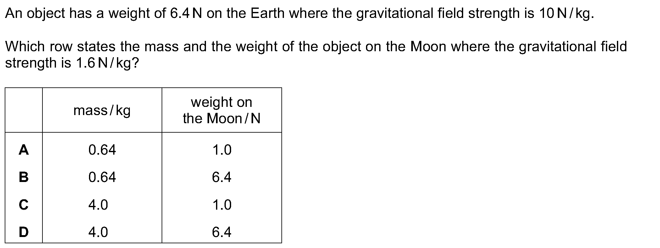 An object of mass 2.0 kg is taken from the Earth, where the gravitational field strength is 10 N/kg, to the Moon, where the gravitational field streng...