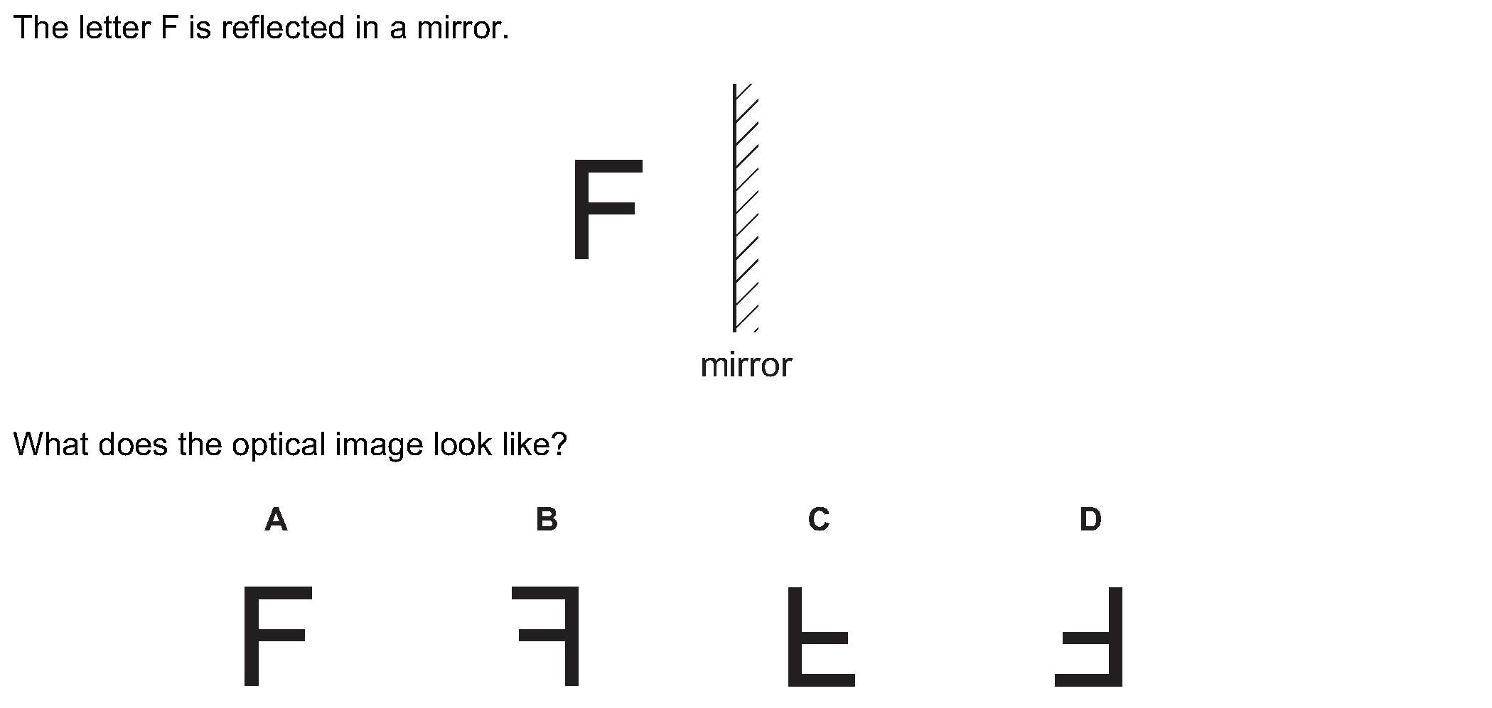 A girl writes the word LEFT on a piece of card.[Image_1: LEFT]She looks at the image of this card, made by reflection by a plane mirror.What does she ...