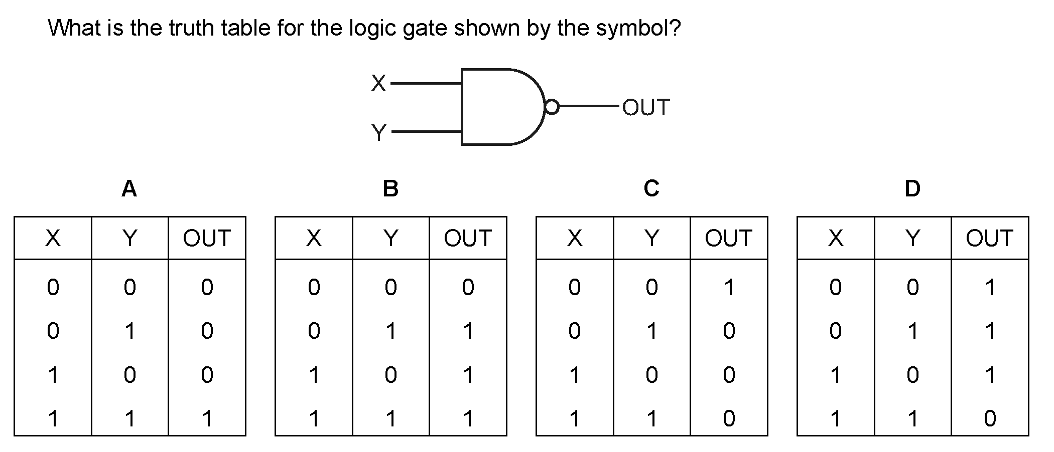 (a) In the space below, draw the symbol for an OR gate.[1](b) Describe the action of an OR gate in terms of its inputs and outputs.......................