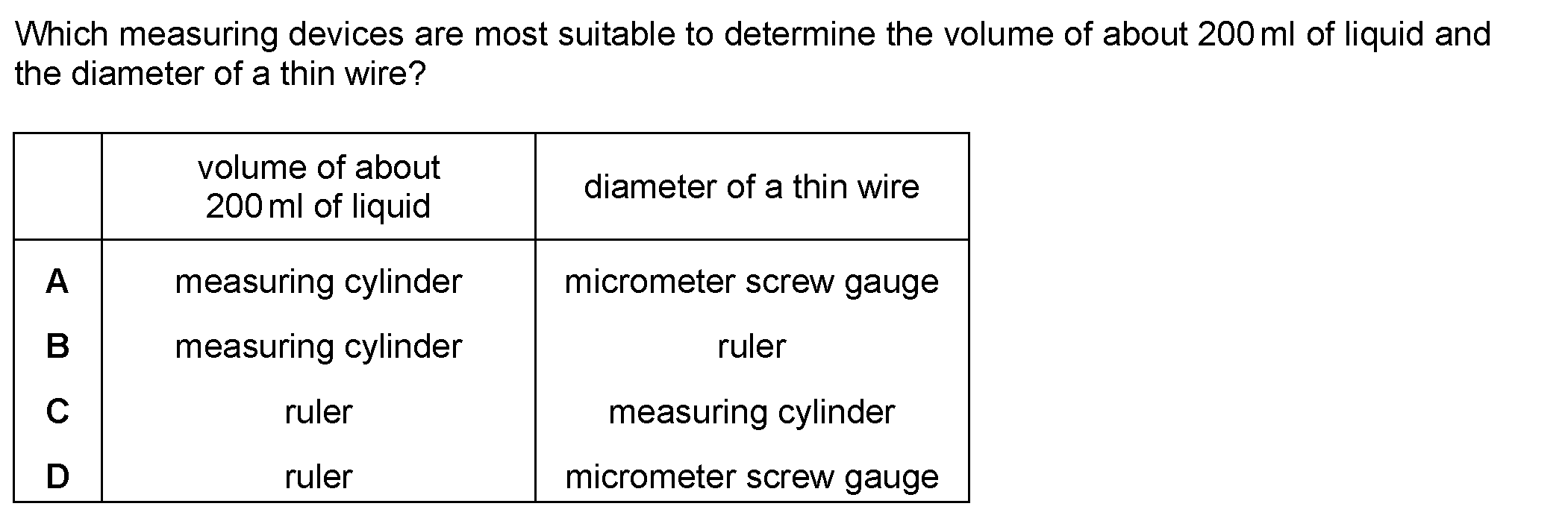 Which items of apparatus are required to determine the density of a liquid? A balance and measuring cylinder B balance and thermometer C metre rule...