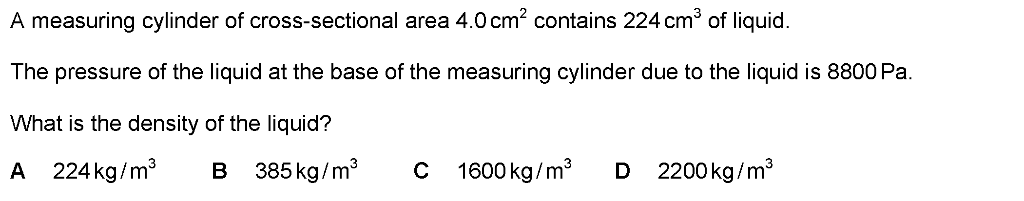 A student fills two containers with water (density 1.0 g/cm^3) and two with oil (density 0.8 g/cm^3), as shown in the diagrams.In which container is t...