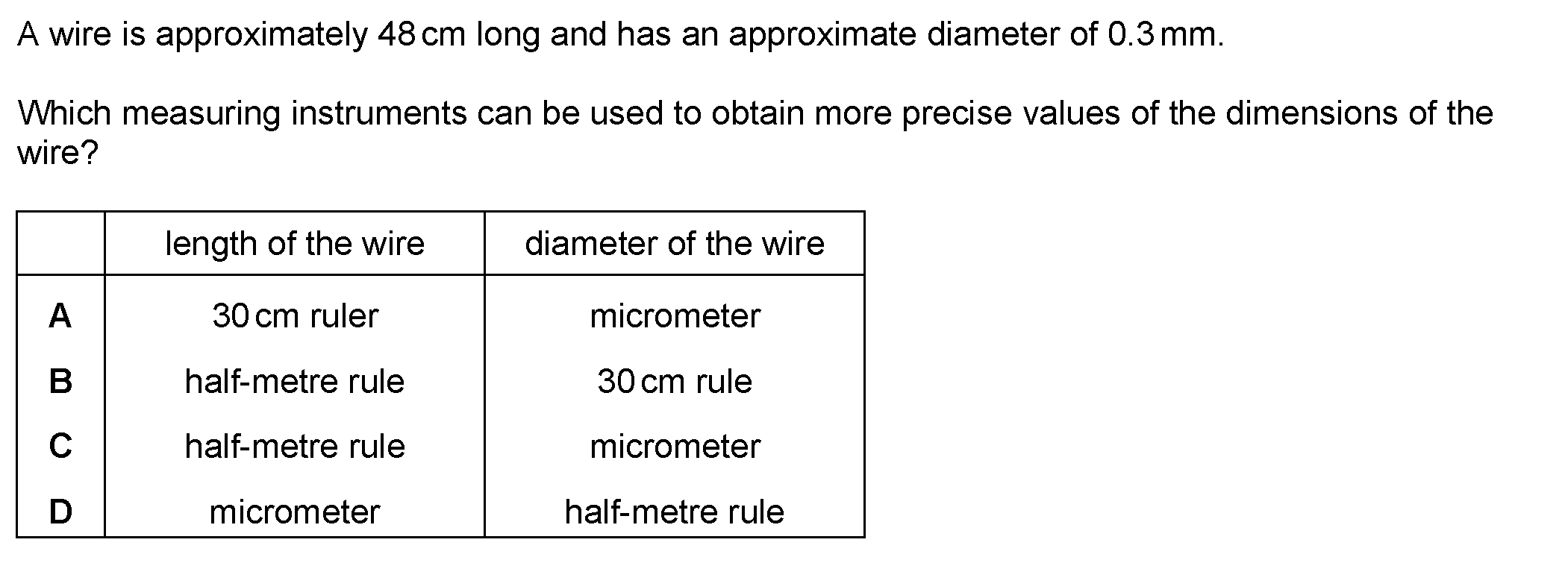 A metre rule is used to measure a length.Which reading is shown to the nearest millimetre?A 0.7 mB 0.76 mC 0.761 mD 0.7614 m