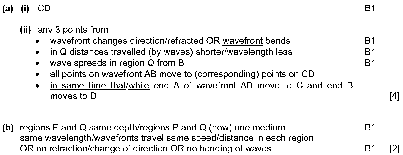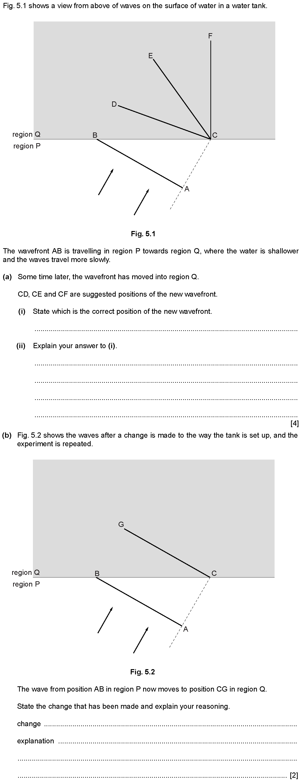 Some plane waves travel on the surface of water in a tank. They pass from a region of deep water into a region of shallow water. Fig. 6.1 shows what t...