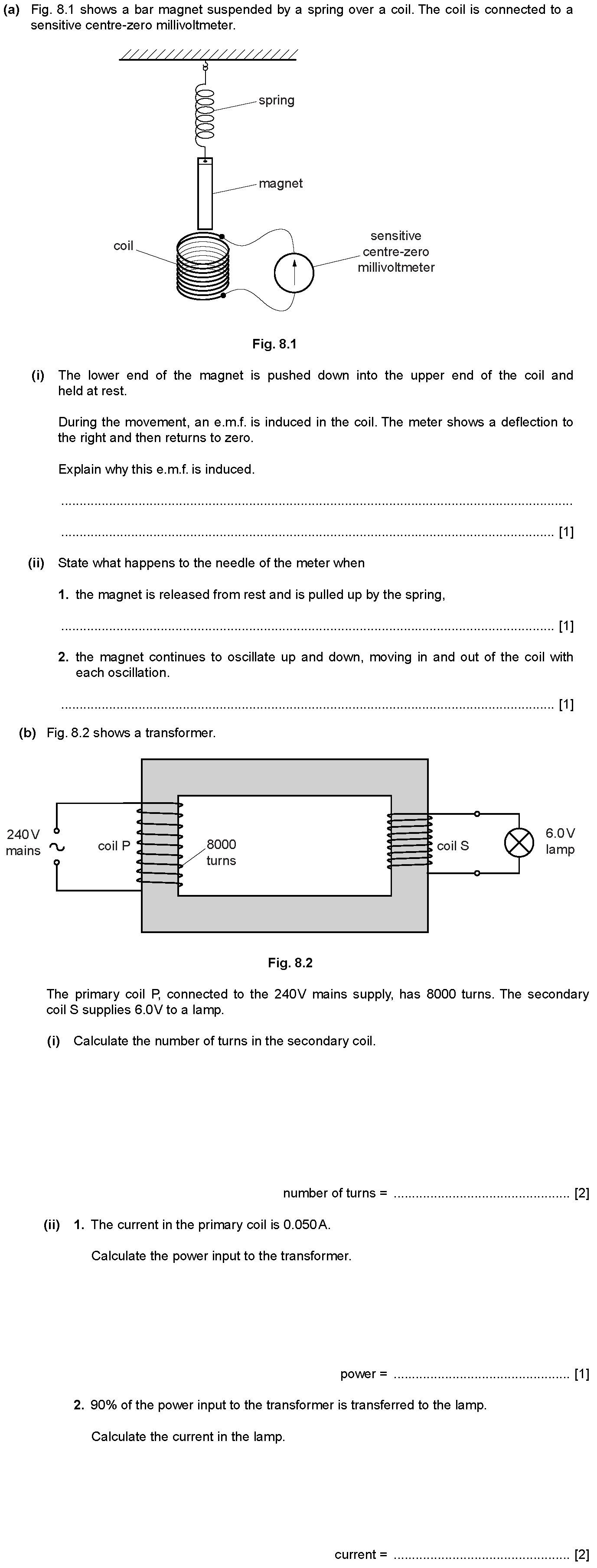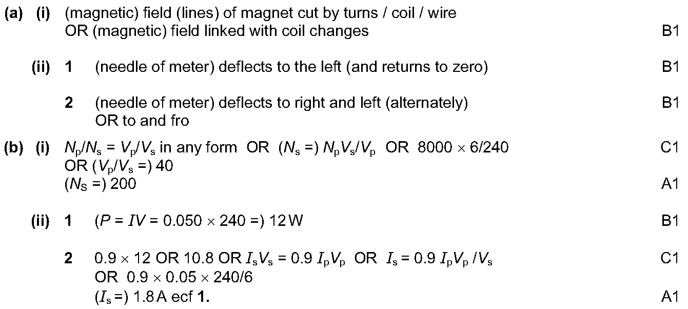 (a) The transformer in Fig. 8.1 is used to convert 240V a.c. to 6V a.c.Fig. 8.1(i) Using the information above, calculate the number of turns on the s...