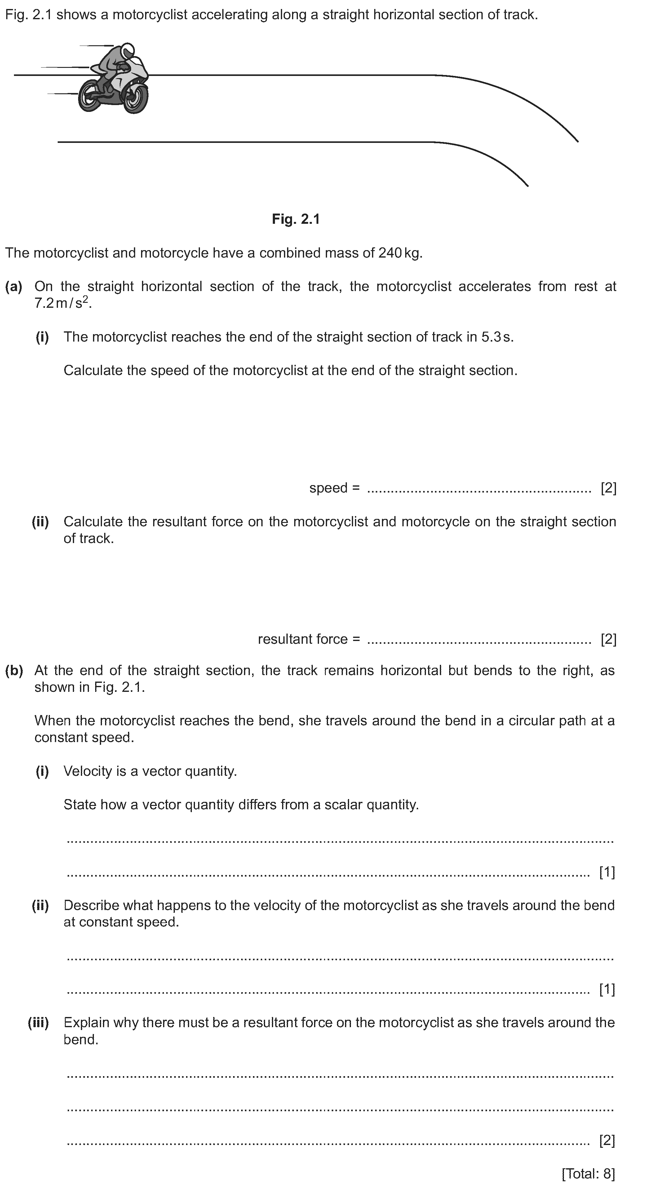 1. (a) (i) State the difference between a scalar quantity and a vector quantity. [1] (ii) Define momentum. [1] (b) A test car crashes into a barri...